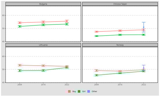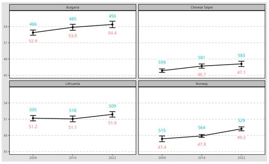Figure 2 presents the trends in countries with medium changes in students’ expected participation in illegal activities (Bulgaria, Chinese Taipei, Lithuania, and Norway). In Bulgaria, the levels of expected participation in illegal protest activities increase steadily, with differences being significant between 2009 and 2016 and 2009 and 2022. This trend is very similar in Chinese Taipei, although the overall results in the three cycles are much lower. In Norway, the difference between 2009 and 2016 is statistically insignificant but is larger and statistically significant between 2009 and 2022 and between 2016 and 2022. In Lithuania, the trend is first downward from 2009 to 2016, although very small (0.14 points) and insignificant, but the difference between 2016 and 2022 is larger and significant.
