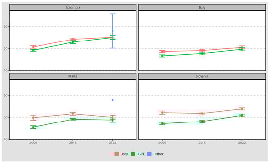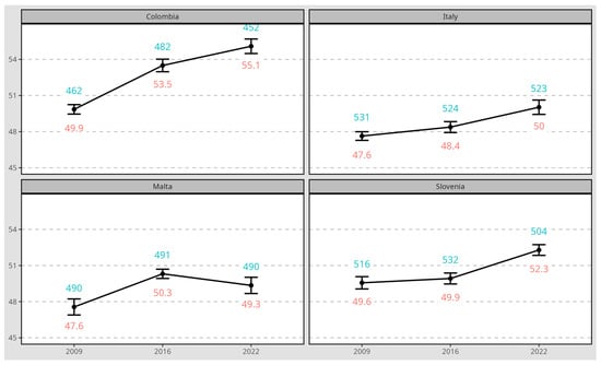 Figure 3 presents the results with the largest changes in students’ expected participation in illegal protest activities. In Malta, the average increases between 2009 and 2016 by 2.75 points, and the difference is statistically significant. In 2022, the average decreases and is significantly lower than in 2016 but still significantly higher than in 2009. In Slovenia, the average increases between 2009 and 2016 but is small (0.35 points) and insignificant. However, the difference between 2016 and 2022 becomes much bigger (2.37 points) and is statistically significant. In Italy, the differences are significant between all three cycles and are increasing over time, from 0.74 (2009 to 2016) to 1.65 (2016 to 2022). The largest increasing trends are observed in Colombia, with all differences being statistically significant. There, the change between 2009 and 2016 is 3.65 points.