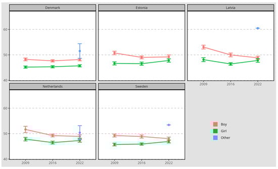 The other countries show different patterns. In Estonia, Latvia, and Sweden, male students have decreasing trends in their expectations, while female students show an increase in their expectations. In Lithuania and Norway, the trends are rather similar: male students have a steady but rather flat trend over time, while the expectations of female students to participate in illegal protest activities have increased. The common aspect in this group of countries is that the expectations of male students decrease or remain unchanged over time, while the expectations of female students increase steadily from 2009 to 2022, and while these gender differences are significant in all cycles, they decrease over time from 10.59 points in Norway and nearly 9 points in Lithuania to 1.10 points in Norway and 2.27 in Lithuania.