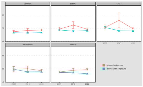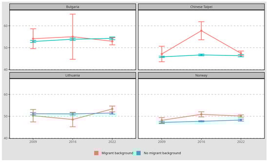 In Bulgaria, students with an immigrant background had higher expectations than non-immigrant students in 2009 and 2016 and then lower in 2022, but none of the differences between students with and without an immigrant background are statistically significant across the three ICCS cycles. In Lithuania, exactly the opposite trends are observed, although the difference between students with and without an immigrant background is statistically significant (students with immigrant backgrounds are higher). In the Netherlands, the trends for both students with and without an immigrant background are monotonically decreasing, with a statistically significant difference in 2016 only (students with an immigrant background are higher).