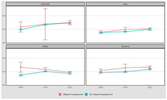 Appendix A). In general, students with immigrant backgrounds have higher expectations for taking part in illegal protest activities in all cycles of ICCS. In Colombia, Italy, and Slovenia, the trends of students with and without immigrant backgrounds participating are steadily increasing. In Colombia, however, the differences between students with and without an immigrant background are not significant in all three ICCS cycles, while in Italy, they are insignificant only in ICCS 2009. In Slovenia, the differences are significant in all three cycles. In Denmark, the trend for students without immigrant backgrounds remains stable over time, while for students with immigrant backgrounds, it is increasing (while small and insignificant in 2009, the differences increase and become significant in subsequent ICCS cycles). In Norway, the trend is quite similar to the one in Denmark, but with a slight decrease for students with an immigrant background in 2022. In Sweden, the trends are also similar, but with a significant, although small, decrease for students without an immigrant background from 2016 to 2022.