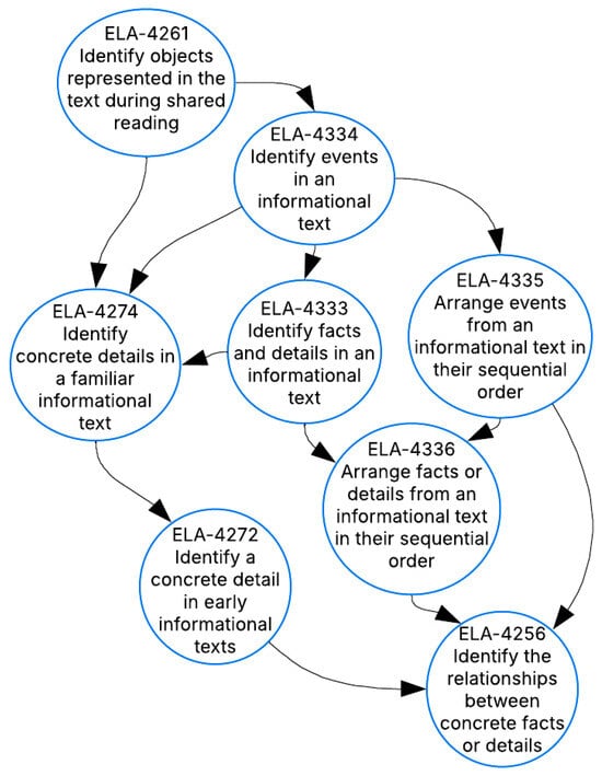 Once an initial set of nodes is specified, developers establish directional connections. This process includes arranging nodes in a tentative order, specifying research-based connections, and filling gaps as determined by expert judgment. Developers begin by ordering nodes by increasing complexity. The literature review may suggest the arrangement of the nodes in the learning map. For example, an empirical study that provides evidence that Skill A precedes Skill B would be represented as Node A with a directional connection to Node B. In the example section of the learning map shown in Figure 1, the literature shows that readers are often able to identify concrete details in familiar texts which they have read multiple times before they are able to demonstrate the same skill in a text they are reading for the first time. This led to the placement of a KSU “identify concrete details in a familiar information text” as a precursor to “identify a concrete detain in early informational texts. For preceding nodes that immediately contribute to the acquisition of succeeding nodes, direct connections link the nodes. Similarly, when there is a hypothesized direct relationship between two skills, a connection is added. The universal design principles of multiple means of representation and expression apply to connections as well. Given maps’ network structure, connections may form alternate pathways around areas of the learning map, allowing students who may need additional or unique support to advance through it. An example of an alternate pathway may be a separate set of nodes that represents concept formation through a particular sensory channel, such as development of phonemic awareness in braille rather than by sight. If the development process includes the creation of multiple interrelated learning maps for a topic (e.g., maps in science and mathematics designed for an integrated unit), the process may include linking the multiple learning maps together through shared or conceptually related nodes.