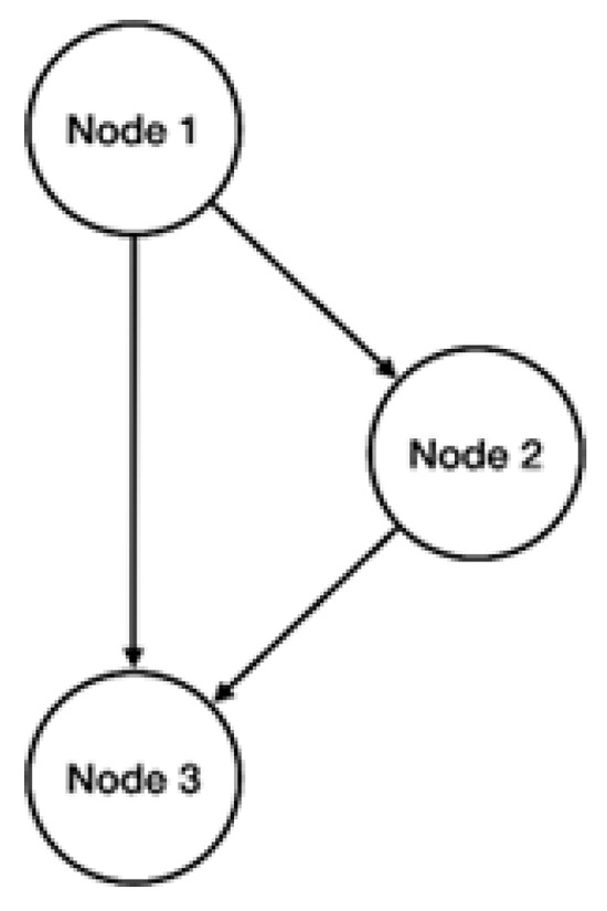The mastery profiles can be mapped onto a learning map to validate the proposed structures. For example, take a simple map structure with three nodes, as shown in Figure 2. There are multiple ways to interpret the structure shown. The first is a strict interpretation of the pathways, where all arrows represent required prerequisite knowledge. Under this interpretation, mastery of Node 1 is a prerequisite for mastery of Node 2, and both Node 1 and Node 2 must be mastered before Node 3 can be mastered. A more flexible interpretation allows multiple possible pathways to the mastery of Node 3. One pathway is to master Node 1 and then directly proceed to Node 3. A second pathway is to master Node 1, then Node 2, and then finally Node 3. In other words, mastery of Node 2 is no longer a prerequisite for mastery of Node 3.