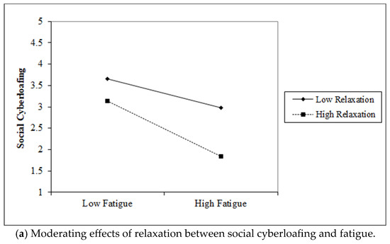 Table 4a,b provide the hierarchical multiple regression results. H3 argues that relaxation interacts significantly with fatigue to negatively influence social cyberloafing. The result supported this argument (β = −0.223, p ≤ 0.01). The plot in Figure 3a suggests that relaxation had a more negative relationship with social cyberloafing when the level of relaxation was higher compared to when the level of relaxation was lower.
