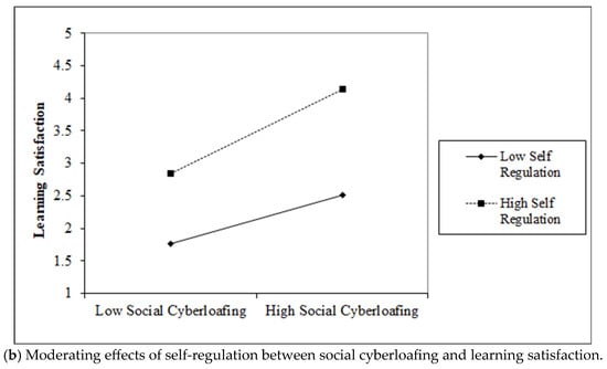 Hypothesis 4 states that self-regulation interacts with social cyberloafing to influence learning satisfaction; in line with this, we found that self-regulation interacted with social cyberloafing to positively influence learning satisfaction (β = 0.240, p ≤ 0.01). The plot in Figure 3b suggests that self-regulation positively affects learning satisfaction when the level of self-regulation is higher compared to when the level of self-regulation is lower.