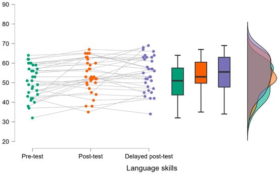Table 1 shows the descriptive data retrieved from the language skills test in the three different moments in which measures were taken. Even though there were initially 43 participants, only 32 completed the language skills test in the three different moments, as they could leave the experiment whenever they wanted. The expected peak of attainment is observed in the post-test measure (M = 53.656), with a growing tendency reflected in the mean of the delayed post-test (M = 54.781). This slight increase suggests that continued exposure to the L2 after the intervention may have contributed to this result. This exposure was probably linked to the theory lessons and the traditional practical sessions.