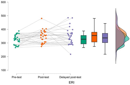 The post-hoc results in Table 6 show that the largest effect size (Cohen’s d = 0.462) occurred between the pre-test and the post-test, with this difference being marginally significant according to the adjusted p-value (pbonf = 0.054). When it comes to the comparison between the pre-test and the delayed post-test, the difference was not statistically significant (pbonf = 0.154) and had a moderate size effect (Cohen’s d = 0.421). Additionally, the size effect (Cohen’s d = 0.042) was small, and the differences were not statistically significant (pbonf = 1.000) for the case of the post-test and the delayed post-test.