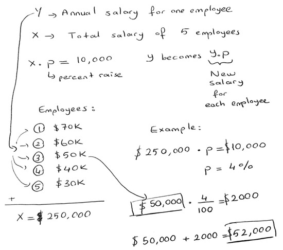 - Our method focuses on creating an equation to determine percent raise. Our variables are X, total salary of 5 employees; Y, annual salary for each employee.