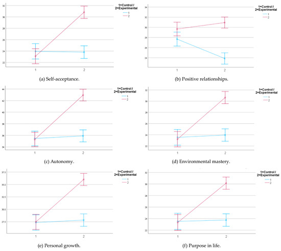 Interaction graphs of psychological well-being factors. The blue line represents the trajectory of the control group, while the red line corresponds to the experimental group. Data points represent variable means. Error bars represent confidence intervals (95%).