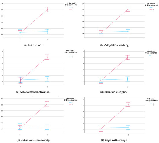 Interaction graphs of teacher self-efficacy factors. (a) Instruction effectiveness; (b) adaptation of teaching to the individual needs of students; (c) achievement of student motivation; (d) achievement of maintaining discipline in the classroom; (e) ability to collaborate with other members of the educational community; and (f) coping with challenges and effectiveness in dealing with change in educational contexts. The blue line represents the trajectory of the control group, while the red line corresponds to the experimental group. Data points represent variable means. Error bars represent confidence intervals (95%).