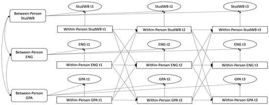 Once the measurement model was accepted, we used the best fitting factor structure for our main analysis. To analyze the longitudinal associations between student well-being dimensions, school engagement components, and students’ GPA, we applied a three-wave multiple indicator random intercept cross-lagged panel model (RI-CLPM; Mulder & Hamaker, 2021). In such a model, longitudinal data are decomposed into stable trait-like between-person differences and temporal within-person dynamics (see Figure 1). Following the modeling strategy described by Mulder and Hamaker (2021), we specified the higher-order random intercepts for each construct across all measurement points to model the proportion of the latent variables that are time-invariant (between-person effects) and included the lagged effects between the within-person centered latent variables to model their relationships over time (within-person effects). The correlations between the random intercepts reflect stable between-person relationships between student well-being, school engagement, and academic achievement. Autoregressive paths represent the within-person carry-over effects, indicating how deviations from individuals’ expected scores at one measurement point predict future deviations in the same variables. Cross-lagged paths indicate whether a deviation from a person’s expected score at one measurement point predicts a future deviation in their expected score on another variable. Again, model fit was accepted if CFI > 0.90, RMSEA < 0.08, and SRMR < 0.08.