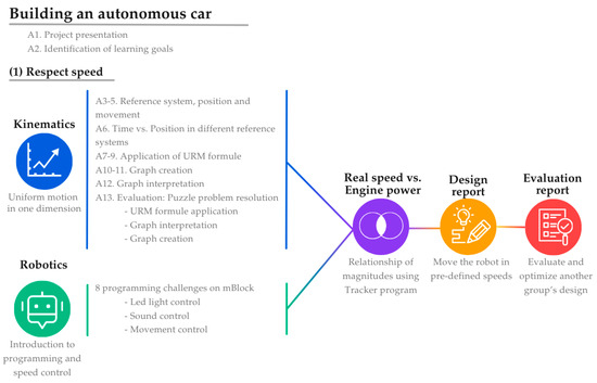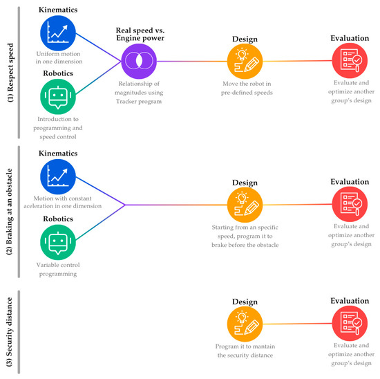 As shown in Figure 1, the approach for the first two challenges follows a consistent process. After presenting the project and identifying their learning goals, students first engage in the content knowledge phase for both kinematics and robotics. Then, they design the program for the specific challenge, and finally, they evaluate and optimize another group’s design. For the third objective of the project about maintaining the security distance between vehicles, there is no new content knowledge, so they only have to do the design and evaluation phases. All the work is performed in teams.