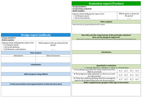 Once this task has been completed, students should reflect on and justify their design in the design report, so that the evaluating team can have as much information as possible in the next phase. Therefore, after the design, all the groups proceeded to analyze the work of another group in the classroom, assessing both compliance with the criteria of their specific challenge and the correctness of the program designed for it. Compliance with the speed criteria is measured once again using the Tracker program. The design and evaluation reports are shown in Figure 3.