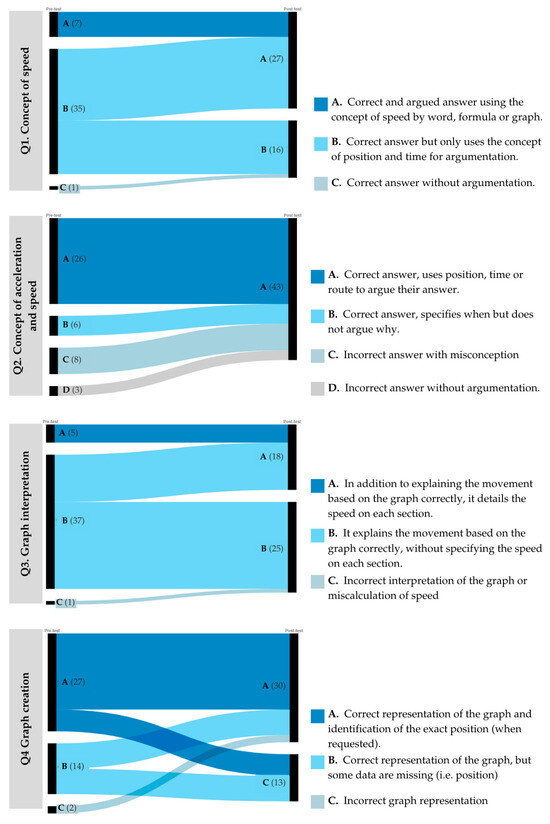 These results show two conclusions to be taken into account: (1) the difficulty of the task is greater in the post-test than in the pre-test; that is, the treatment of the information from one graph to another is more complicated than the conversion from words to graphs. Conversely, (2) the negative results in the post-test mean that the suggested tasks are insufficient to overcome this difficulty. It should be noted that the master’s students participating in this study only completed the activities related to the first objective of the TLS. In the original design, more activities on the graphic expression of movement are included in the second objective. For this reason, if only the first objective is performed with the students, some more activities should be added in this aspect to ensure that this difficulty is overcome.