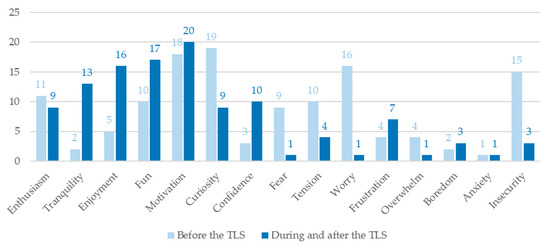 Results for the attitudes questionnaire regarding their emotions before and after the TLS.