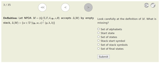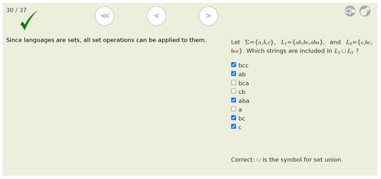- Mohammed, M., Shaffer, C. A., & Rodger, S. H. (2021, March 13–20). Teaching formal languages with visualizations and auto-graded exercises. 52nd ACM Technical Symposium on Computer Science Education (pp. 569–575), Virtual Event, USA. [Google Scholar] [CrossRef]