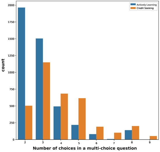 The number of active learning or credit-seeking sessions based on the median number of choices for all multi-choice questions in a given session.