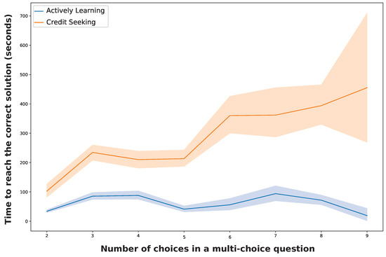 In total, 39.6% of work sessions contained at least one single-choice question attempt. Of these, 66.0% were clustered as active learning sessions, and 34.0% were clustered as credit-seeking sessions. In contrast to multi-choice questions, increasing the number of choices in single-choice questions did not change the students’ behavior. This means that if a student was actively learning in most of their PI frameset sessions, then it was less likely they would convert to credit-seeking behavior due to a single-choice question, while they were more likely to perform so for multi-choice questions. Credit-seeking students did not take longer than actively learning students to correctly answer single-choice questions. However, in credit-seeking sessions, students attempted to answer single-choice questions quickly with an average of 14.70 seconds between any two consecutive attempts, while it took 21.04 seconds for active learners, a statistically significant difference ().