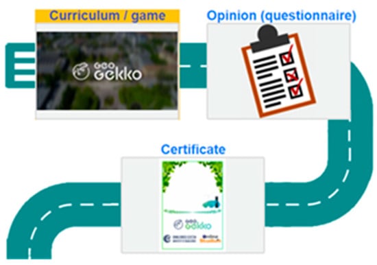 The “GeoGecko” learning process: course/game, questionnaire, certificate.