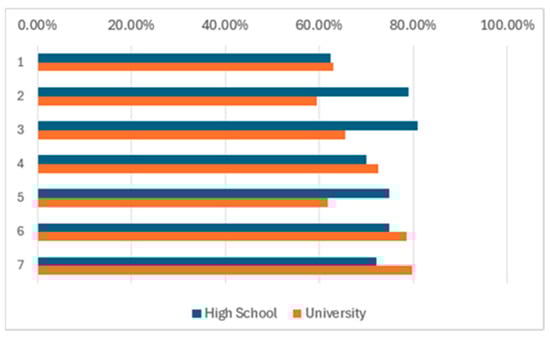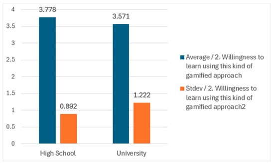 After assessing perceived effectiveness, the next step involved examining participants’ willingness to engage in game-based learning. Similar to the previous question, a notable difference was anticipated based on age characteristics. The results (see Figure 6), though not definitive, show a slight trend supporting the assumption. High school students expressed a greater willingness to learn through the introduced method, with their responses also showing little variation.