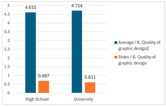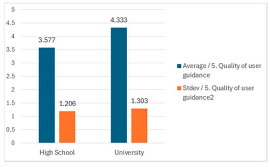 The testing process began with an individual registration and a self-guided login and startup process. Participants were invited to rate this aspect using a six-point Likert scale, as with previous evaluation criteria. The results are shown in Figure 11. Overall, both student groups gave the registration and login process a positive rating, with university students providing slightly higher scores.