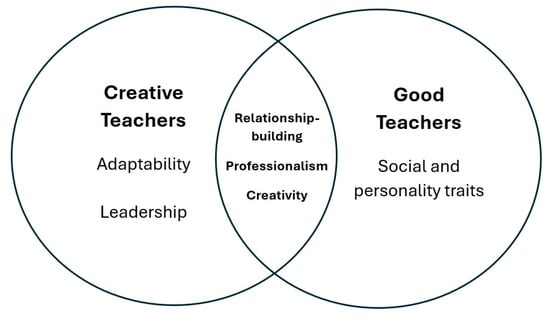The current study explored preservice teachers’ perceptions of the characteristics of creative teachers and good teachers. The results indicated that preservice teachers view these two concepts as different but interconnected (see Figure 1). The top five characteristics identified for each group showed no overlap. For creative teachers, preservice teachers prioritized traits such as valuing students’ creativity, being creative, open-minded, imaginative, and adaptive. In contrast, characteristics such as dedicated, helpful, knowledgeable, reliable, and trustworthy were emphasized for good teachers. However, when examining the bottom five characteristics for creative and good teachers, there were some shared perceptions, with sensitive and authoritative being seen as the least relevant qualities for both. This overlap may suggest that preservice teachers do not see these traits as vital for good teaching or creativity.