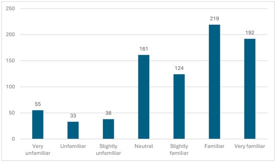 Figure 1 shows the students’ familiarity with AI tools. The question was “how familiar/unfamiliar are you with AI tools such as ChatGPT?” The majority of students reported themselves as familiar or very familiar with AI tools. Out of a total of 822 participants, 192 (23.4%) participants reported themselves as “very familiar”; 219 participants (26.6%), “familiar”; 124 (15.1%) participants, “slightly familiar”; 161 (19.6%) participants, “neutral”; 38 (4.6%) participants, “slightly familiar”; 33 (4.0%) respondents, “unfamiliar”; and 55 (6.7%) respondents, “very unfamiliar.” These results indicate that a large proportion of the sample had a moderate-to-high level of familiarity with AI tools, with more than half of the participants (50%) reporting being at least “slightly familiar” or higher. A t-test showed no significant difference between male (M = 4.96, SD = 1.74) and female (M = 5.12, SD = 1.65) participants for familiarity with AI tools, t = −1.35, p > 0.05.