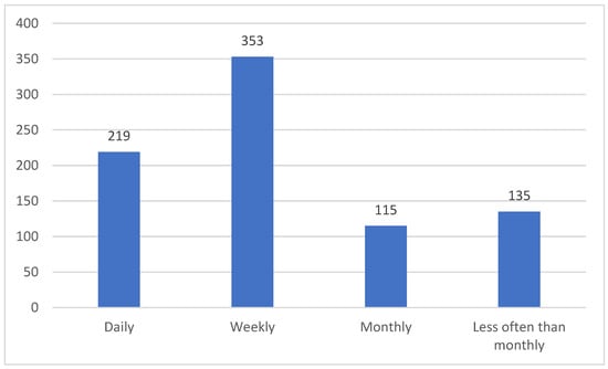 Figure 2 presents how frequently students use AI tools for academic purposes. Responses were categorized into four frequency levels: “daily”, “weekly”, “monthly”, and “less than monthly”. Of the total 822 participants, 219 (26.6%) participants used AI tools daily; 353 (42.9%) participants used them weekly; 115 (14.0%) participants, monthly; and 135 (16.4%) participants, less often than monthly. Cumulatively, a significant number of participants (572 participants or 69.6%) used AI tools either daily or weekly.