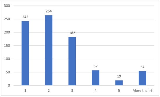Figure 3 shows the number of AI tools students use for academic purposes. The majority of students used more than one AI tool. Of the participants, 246 (29.5%) participants used one AI tool; 264 (32.2%) participants, two AI tools; 182 (22.2%) participants used three AI tools; 57 (7.0%) participants, four AI tools; 19 (2.3%) participants, five AI tools; and 54 (6.6%), more than six AI tools.