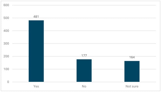 Figure 4 shows whether students have heard about the guidelines or policies on the use of AI tools from their professors. Responses were categorized into three options: “yes”, “no”, and “not sure”. Out of the total 822 participants, the majority of participants, 481 (58.5%) participants, reported that they were aware of the guidelines on the use of AI tools from their professors; 177 (21.5%) participants indicated that they did not hear about any guidelines or policies on the use of AI tools; and 164 (20.0%) participants were not sure whether they heard the guidelines. These results show that while more than half of the participants heard about the guidelines, a significant number of the participants did not hear or were not sure whether they heard about the guidelines.