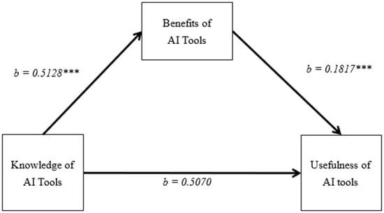 The relationship between knowledge of AI tools and usefulness of AI tools mediated by perceived benefits of AI tools. *** p < 0.001.