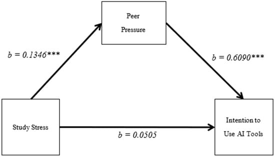 The relationship between study stress and intention to use AI tools mediated by peer pressure. *** p < 0.001.