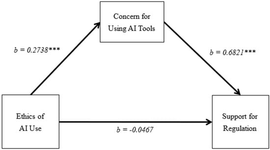 The relationship between perceived ethics of AI use and support for regulation mediated by concern for using AI tools. *** p < 0.001.