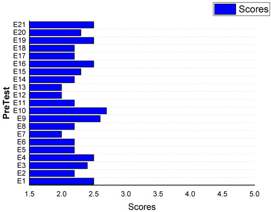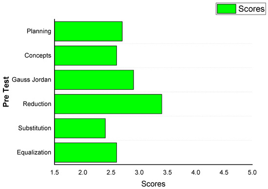Figure 1 shows that 100% of the students obtained low grades in the pretest, so they failed the subject related to linear equations. Using pretest scores as a baseline for a rating scale of the evaluation system of the institution under study, in which, a rating scale of 1 to 5 is stipulated, and it is established that a grade lower than 3.2 is considered a failure. In total, 100% of the students were in the range of 2.0 to 2.7, that is, at a low level. This result is consistent with the diagnosis made at the beginning of the research. The low results are related to the difficulties that students have in associating the problems of the context with mathematics topics, i.e., the low interest in this area and the teaching methodology that was being implemented.