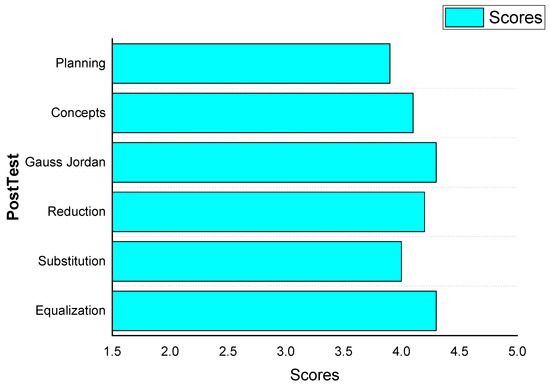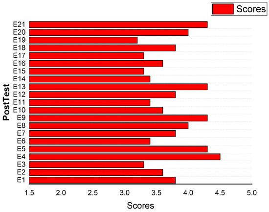 Figure 4 shows the results obtained from the post-test in different methods. It was determined that 21% of the students obtained a score higher than 3.2 in the pretest, while in the post-test, 100% of the students obtained scores higher than 3.9. The range of scores in the pretest was from 2.2 to 3.4, while the range of scores in the post-test was from 3.9 to 4.3. The students demonstrated greater mastery of the conceptual elements and established that two factors influenced this. On the one hand, they had the possibility of consulting the information in the app on repeated occasions, and, in order to make contributions in the group, they were forced to be clear about the topics and prepare the ideas proposed in the work teams with arguments.