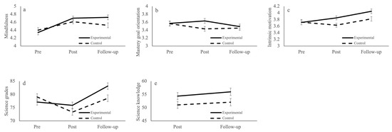 For science grades, a significant interaction between group and time was obtained. As can be seen in Figure 1d, Bonferroni post-hoc comparisons revealed a significant increase at follow-up as compared to pre- and post-test (p’s < 0.001), but not between pre- and post-measure (p = 0.847), among participants in the experimental group. Among participants in the control group, a significant decrease in science grades was observed between pre- and post-measures (p < 0.001), followed by an increase that did not yield a significant difference between pre- and follow-up measures (p = 1). In addition, a significant main effect of time was obtained. Data from the science knowledge test were available for the post- and follow-up measures only. The analysis yielded a significant main effect of group (see Figure 1e).