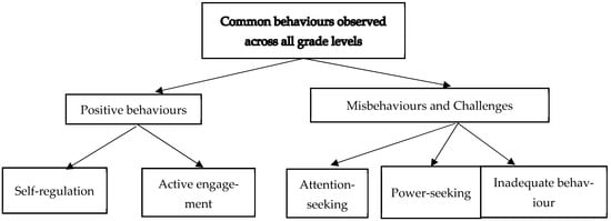Throughout the twenty lesson observations, both the positive and negative behaviours of the students were observed and noted. Even though there were some minor differences in their behaviours, interactions and responses to the teachers at each grade level, the vast majority of behavioural issues overlapped. Students’ actions were coded into two categories: positive behaviours and misbehaviour or challenges. Below is a graphical representation of the categories and subcategories that characterize student behaviour (Figure 1).