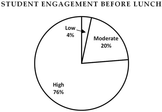 In addition, students’ interactions were meticulously documented at 10-min intervals throughout the lesson period in each class. The subsequent analysis of the data revealed that there was no statistically significant difference in student interactions prior to and following the lunchtime period in the primary school setting. However, a marginal increase in the moderate level of student interactions was observed after lunchtime. Students’ interactions were slightly reduced by 10% after lunchtime from a high level to a moderate level. After lunchtime, students appeared to be more reluctant to engage with their peers and demonstrated a more disengaged approach to learning and classroom work. Below (in Figure 3 and Figure 4) we present a graphical representation of student engagement before and after lunch.