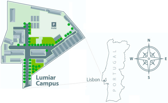 The Higher Institute of Education and Sciences (ISEC Lisboa) is located in the heart of Lisbon, the capital of Portugal, at the Lumiar campus. This campus spans an area of 30,000 m2, with 17.1% designated as green areas (Figure 1).