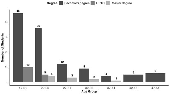 This study included 149 participants—ISEC Lisboa students—from various courses. The gender distribution was 34.9% male (n = 52) and 65.1% female (n = 97). Most respondents were aged 17–21 (38.3%; n = 57), followed by 22–26 years (30.2%; n = 45) and 27–31 years (11.4%; n = 17). Participants were enrolled in different courses, with 10.1% (n = 15) in an HPTC, 79.9% (n = 119) in a Bachelor’s degree, and 6.71% (n = 10) in a Master’s degree (Figure 3).