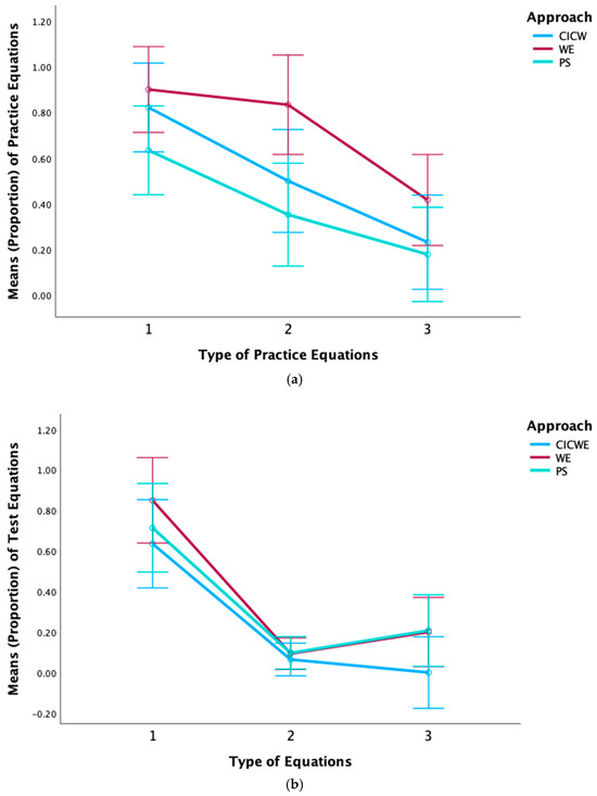 The PS approach is expected to be more effective than the WE approach for high prior knowledge students, in line with the expertise reversal effect (Kalyuga et al., 2003). In the present study, students with high prior knowledge are likely to treat multiple elements as a single element, enabling them to process the CICWE with a lower level of element interactivity compared to students with low prior knowledge. Furthermore, the CICWE approach offers high prior knowledge students the opportunity to allocate cognitive resources toward deep learning of the critical features of the solution steps. Specifically, the CICWE approach addresses conceptual barriers such as the manipulation of negative numbers and pronumerals when learning to solve linear equations. As Ericsson (2006) emphasizes, the development of expertise requires deliberate practice focused on improving specific areas of weakness within a domain (Pachman et al., 2013). In this context, deliberate practice targets the student’s weak points in understanding specific concepts related to solving linear equations. Consequently, the additional instructional support provided by the CICWE approach—targeting a particular conceptual barrier—would enable high prior knowledge students to perform better than those using the PS approach. Therefore, for high prior knowledge students, the performance outcomes for Type 2 and/or Type 3 equations are expected to follow this order: CICWE > PS > WE (Hypothesis 2b).