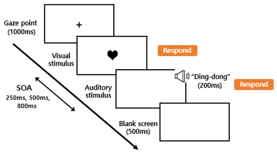Heart and star shapes (both black) and car horn and doorbell sounds (both 200 ms) were used as the first and second stimuli, respectively. The visual stimuli were presented with the dimensions 2.5 × 2.5 cm in the middle of a notebook screen. We edited the auditory stimuli, car horn and doorbell sounds downloaded from an open-access website (https://www.youtube.com/watch?v=FQc5zRy6wBU accessed on 15 May 2016, https://www.youtube.com/watch?v=0iOxXSctJHE accessed on 15 May 2016), to the same length and decibel level using a computer program (Audacity1.3 Beta software) and presented them through the built-in speaker of the notebook.