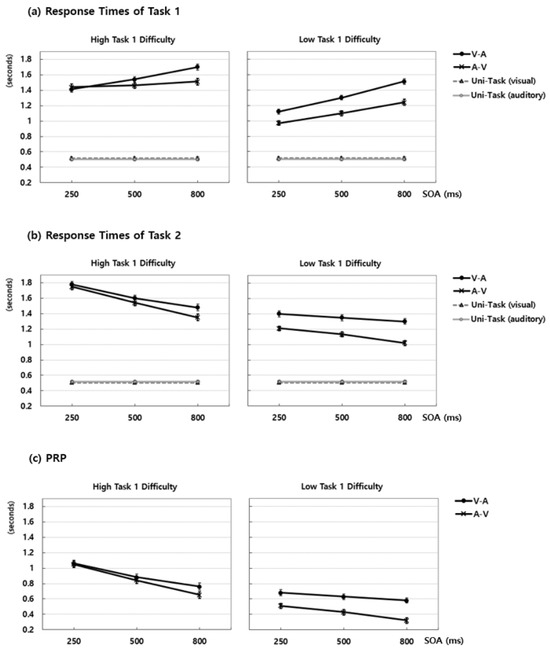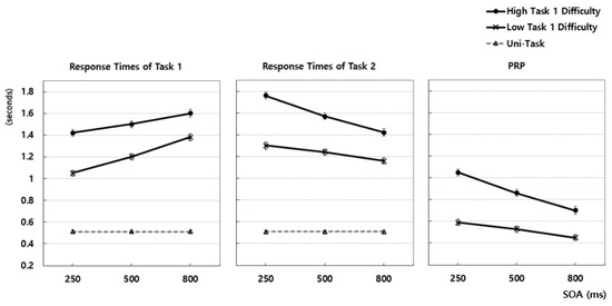 Response times of the first and second tasks and psychological refractory period according to the stimulus onset asynchrony and task 1 difficulty. Error bars represent standard errors.