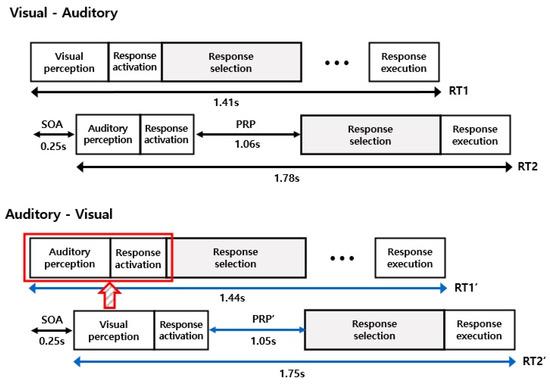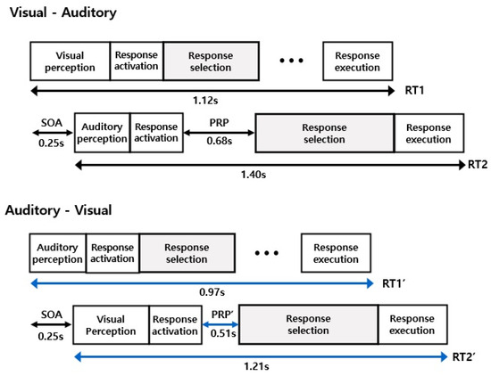 Many studies have suggested the efficiency and dominance of auditory information processing in young children (Kim & Yi, 2017; Robinson & Sloutsky, 2004; Sloutsky & Napolitano, 2003). The studies have assumed that these results stem from earlier maturation of the auditory system and the processing characteristics of each sense. Meanwhile, others have demonstrated that visual information attracts participants’ attention more easily and can be processed with strong impact when they move or appear (Mateeff et al., 1985; McGurk & MacDonald, 1976). Therefore, we examined the children’s visual–auditory versus auditory–visual PRP dual-task performance, which has not yet been investigated. This study provides fundamental academic insights into cognitive development by examining the micro-level sequential processing characteristics of visual–auditory and auditory–visual dual-task performance in young children.