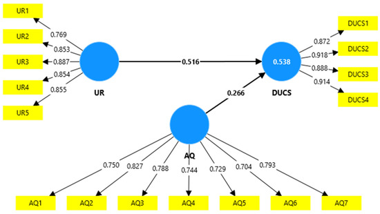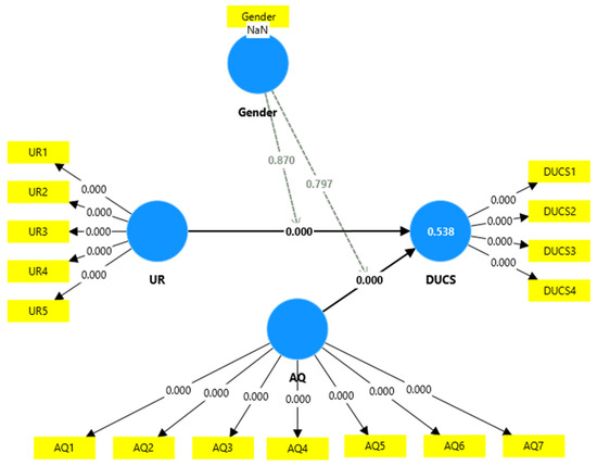 The results of the PLS analysis in this study investigating the relationship between university reputation (UR), academic quality (AQ), and students’ decision when choosing university (DUCS) with the moderating role of gender are as follows: