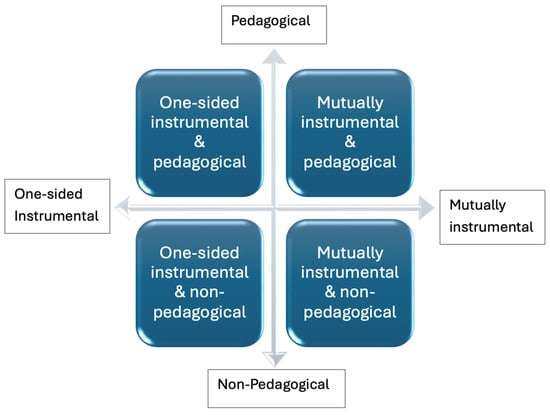 One axis employs instrumentalism for theoretical grounding exploring how the disciplines are operationalized with respect to each other. The spectrum reaches from visions of STEAM where aspects of one or several disciplines are operationalized in the service of a primary discipline (one-sided) to a transdisciplinary vision where all disciplines are mutually intertwined. The other axis focuses on pedagogical considerations and manifestations in various STEAM visions that range from those wholly focused on learning to those that do not address learning at all.