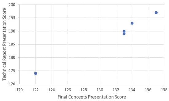 To explore the relationship between the quality of students’ implementation of the HCD processes and the quality of their final products, the Pearson’s correlation coefficient was calculated using the scores of the six groups on the Final Concept Presentations and on the Technical Report Presentations. Figure 2 shows the correlation between the Final Concept Presentations scores and the Technical Reports Presentations scores.
