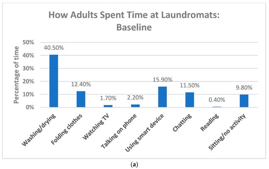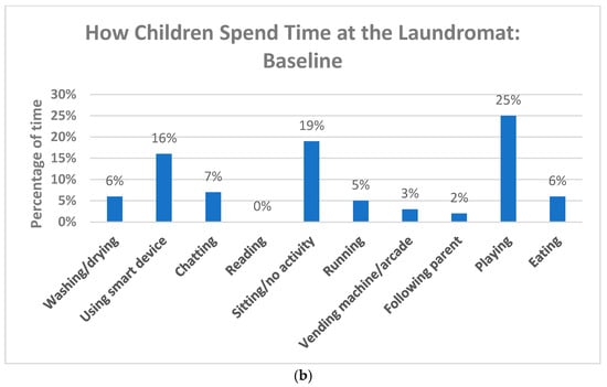 Collapsing the data across laundromats, as Figure 1a,b shows, our baseline observations indicated that adults spent time washing and folding (52.9% of actions), followed by time on their smart devices (15.9% of actions), chatting (11.5%), sitting or standing (9.8%), and ‘other’ including watching TV (1.7%), or talking on their phone (2%). There was negligible reading activity. Left to their own devices, children’s activity was primarily spent playing independently (25%), using a smart device (16%), standing or sitting (19%), among other activities. No book reading activity was observed.