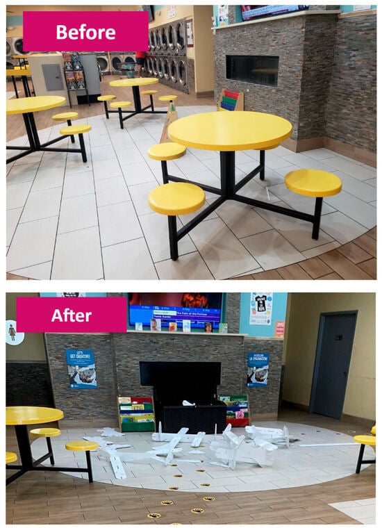 Prior to any design changes, the research assistants conducted baseline observations in each of the three laundromats. The purpose of the baseline observations was to understand how time was spent in each laundromat for adults as well as children. Each research assistant was assigned to visit each of the laundromats for 2 h per visit to observe activities at different hours of the week and weekend. After first mapping the physical configuration of the laundromat, they conducted frozen time checks, a momentary time sampling method to examine activity. At 15 min intervals, the research assistant would walk through the laundromat and mark where each adult and child might be standing or sitting and what they might be doing at that moment. Over the course of two weeks, the researchers observed activities for 8 h in each laundromat for a total of 24 h, marking actions by adults and older teens, and children aged 8 and under.