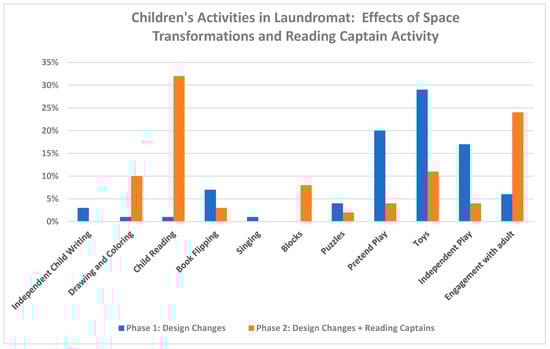 In the following results, we first examine children’s activities in the laundromat as a result of the changes in the environment alone, specifically the addition of literacy-related materials. We then broaden our lens to understand how Reading Captains might influence the types of interactions and behaviors of children in these activity settings. Lastly, we focus on the qualitative features of these interactions, highlighting the ways in which these community volunteers appeared to build connections with children and their families through culturally and linguistically responsive talk grounded in the daily activities of their neighborhood.
